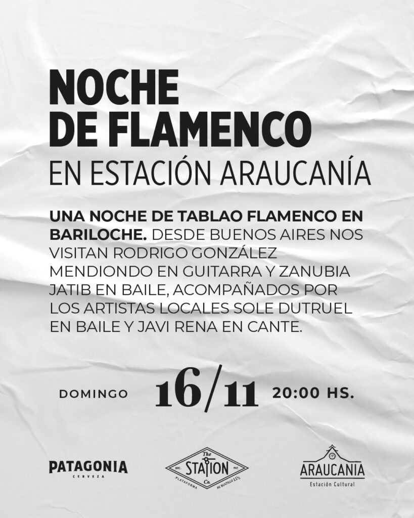 Llega una jornada de Tablao Flamenco a Bariloche. Desde Buenos Aires nos visitan Rodrigo González Mendiondo en guitarra y Zanubia Jatib en baile, quienes serán acompañados por los artistas locales Sole Dutruel en baile y Javi Rena en canto, en esta presentación única en el escenario de Estación Araucanía.